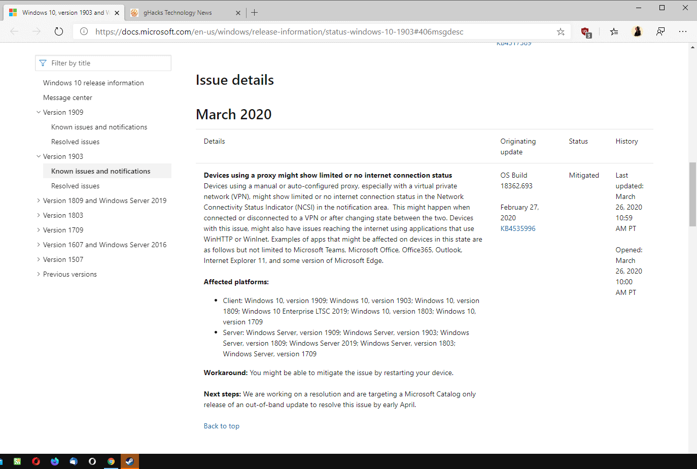 Windows users who run recent (and not so recent) versions of Windows 10Â may have noticed network connectivity issues recently. Microsoft acknowledged a new issue for all supported versions of Windows 10 on March 26, 2020 that comes in two different severity levels.